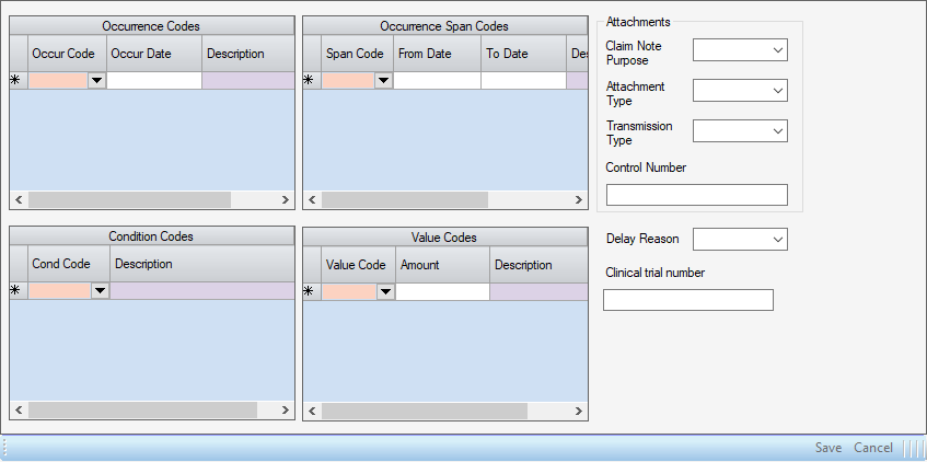 NOTE: The drop-down fields populate from the UB Condition Code, UB Occurrence Code, UB Occurrence Span Code, and UB Value Code Enterprise Code Tables. These are Code Tables that are created and maintained by the organization.