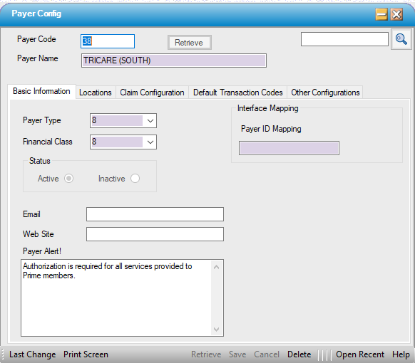 If Standardize Payer Code was selected in Enterprise Configuration, then Payers will need to be created in Payer and configured here. Payer Type, Financial Class, and Payer ID Mapping will be read only on the Basic Information tab of Payer Configuration if Payers have been created separately via the Payer form.