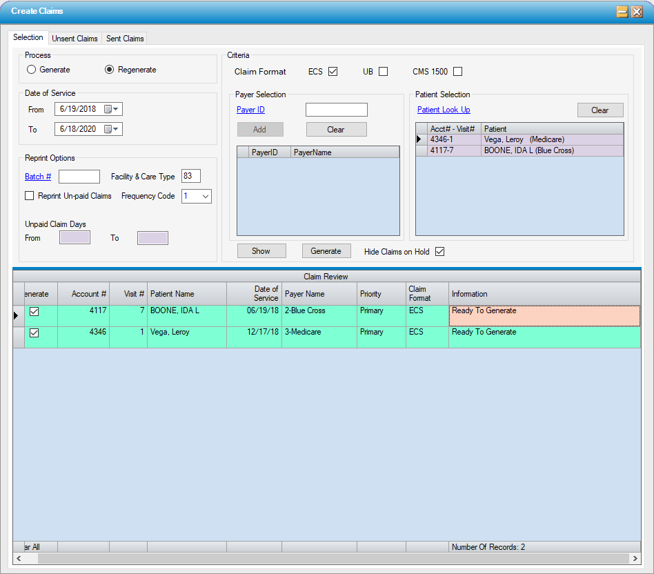 The graphic below shows the Regenerate Claims option with 2 patients selected and the associated claims displayed.