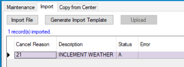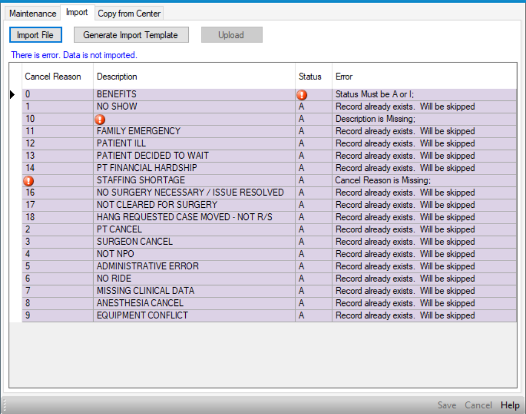 - If there are errors, a blue alert will indicate that errors exist, and the file will not import. There will be an error ball in the column where the error exists and an explanation in the Error column.