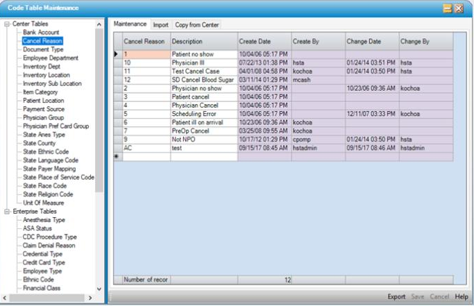 NOTE: User permissions must be granted to maintain Code Tables. Permission can be granted for all tables or individually. Managers at independent centers may have access to all tables, whereas managers at centers that are part of a larger organization may have access to only the Center Tables.
