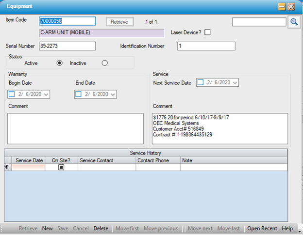 If a center has multiple units of the same Equipment (i.e. 2 C-Arms), it is not necessary to create a separate item master record for each one. Multiple Equipment records of the same type can be associated to one item master record through the Equipment form.