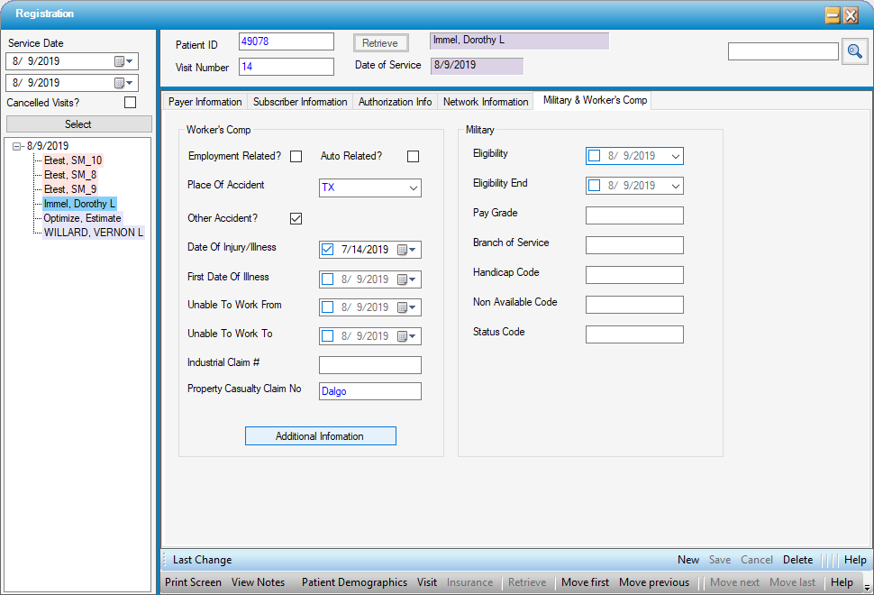 Information relative to third party payers, such as workers compensation or automobile related claims, can be entered on this tab. NOTE:Information entered here is informational only. For a date of injury to appear on a claim, it must be entered on the Additional Information tab in Charge Entry, under Occurrence Codes, which can be accessed from this form by selecting .