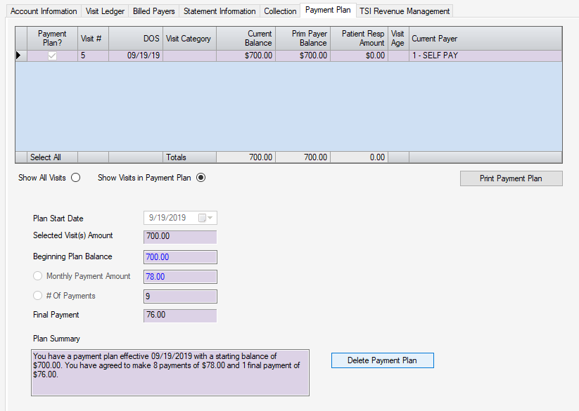 Note that the is a dynamic function that changes to once the plan has been established. To remove a payment plan, select this function. To make changes to an existing payment plan (adding new visits, editing the Monthly Payment Amount, editing the # of Payments), the existing plan must be deleted and a new plan established.