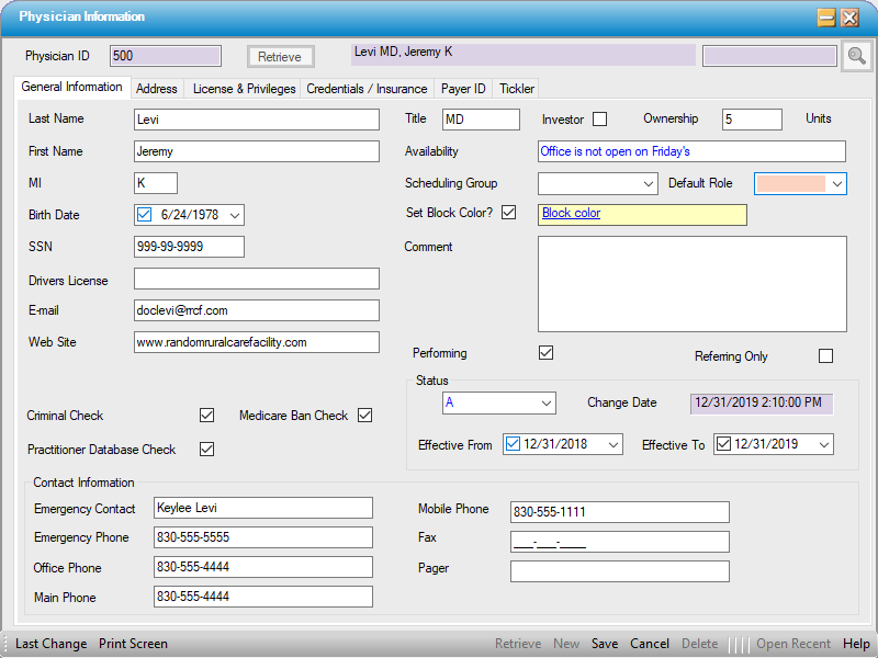 The Physician Profile serves many purposes. All providers that will be scheduled or referenced in HST Practice Management must first be entered in the Physician Profile: including anesthesiologists, supporting physicians, referring physicians, and CRNAs.  Once a physician is entered, the Physician Profile affords the user the ability to track additional information such as Licenses, Privileges, Credentials, and Insurance.