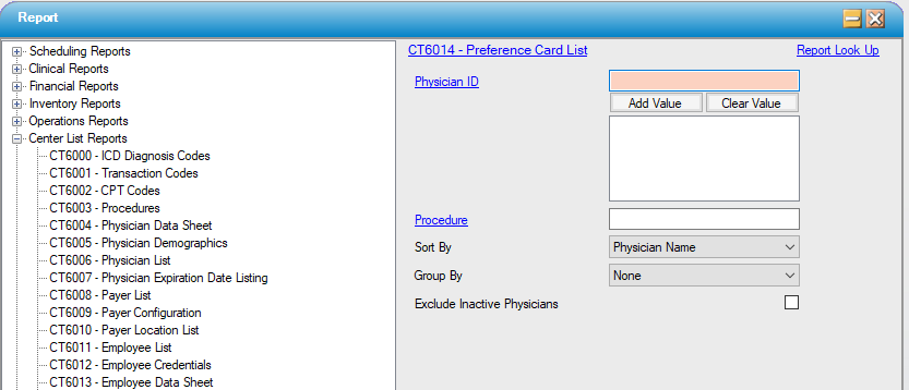 Filter by specified Physician ID(s) and/or specified Procedure(s). Inactive Physicians can be excluded.