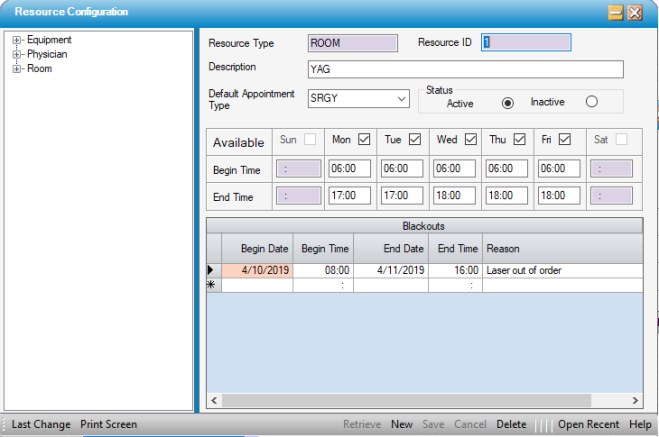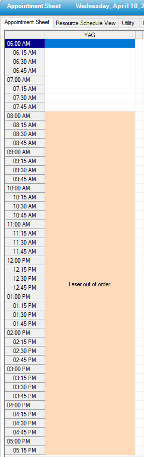 - Blackouts entered for equipment will be displayed on the Appointment Sheet. For example, YAG room is not available on 4/10/2019 because the equipment is broken. The user would see this reason on the Appointment Sheet.