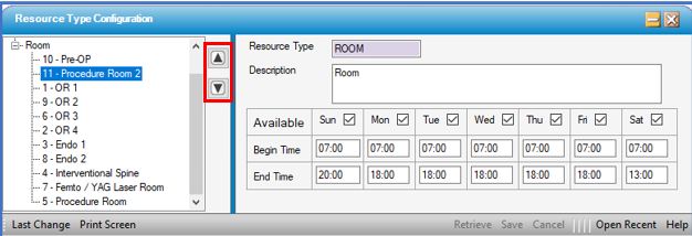 This is where the display order of the rooms on the Appointment Sheet can be changed. Open the tree structure for Rooms, click on a room, then click to move it up or