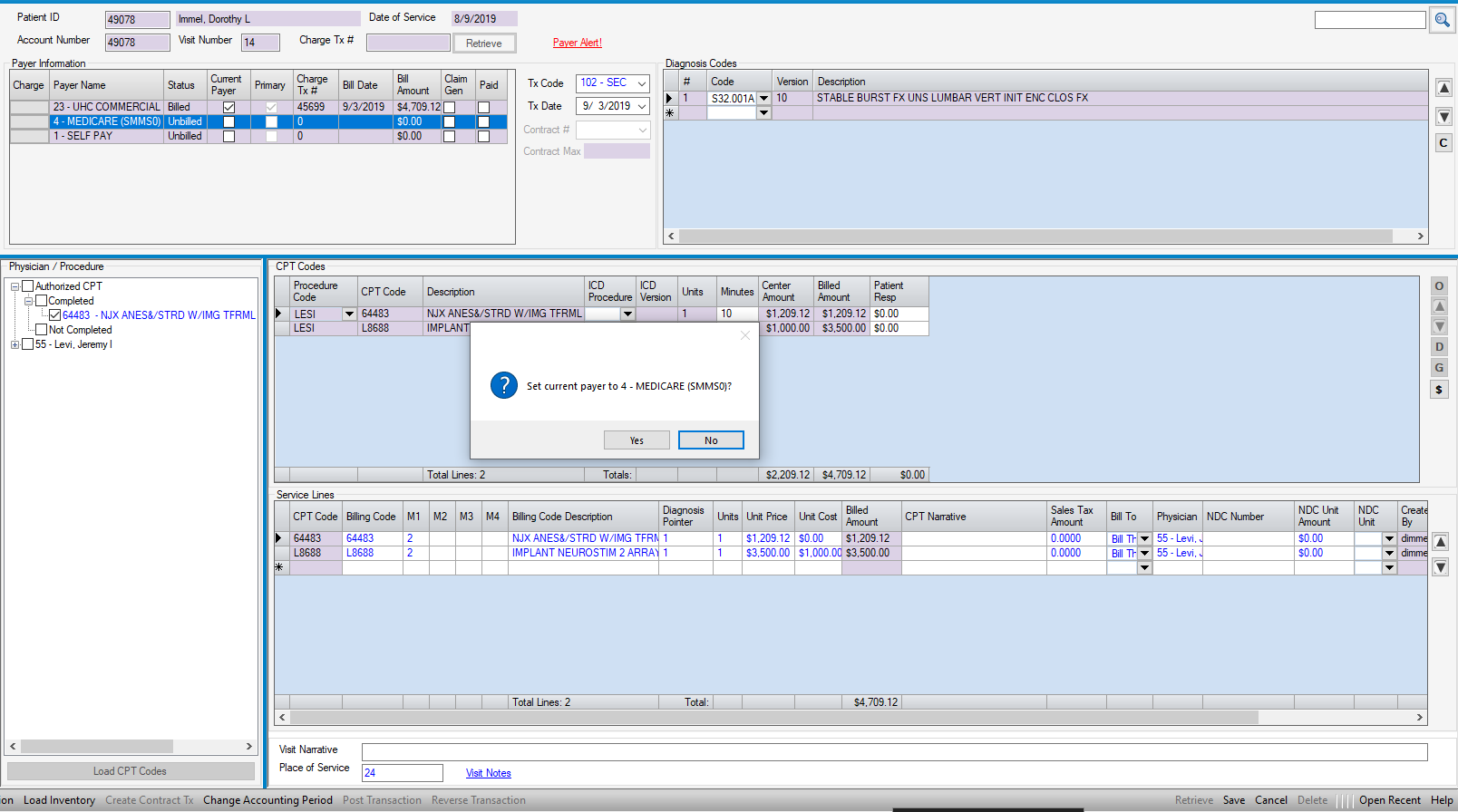 If was selected, or if billing the secondary without posting a primary payment, retrieve the primary charge and double-click on the “Charge” cell in the Payer Information grid to the left of the insurance to be billed.  This will put the form into ‘New’ mode and allow entry of diagnosis pointers or any other data that may be required to bill the secondary or subsequent payers. Once edits are completed and save selected, a pop up will ask whether to set the secondary as the current payer. To proceed, simply select yes.