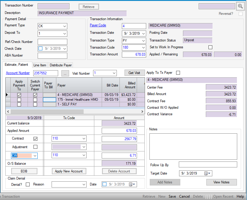 In the  Payments and Adjustments  form, enter the Transaction Information for the primary payer, then enter the patient account number and select the appropriate visit. Enter the primary payment in the Applied Amount field. (This can be $0.00 if the primary allowable was applied to the patient's deductible.) Enter Contract Write Off if not applied at time of Charge Entry.