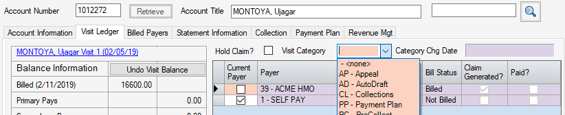 NOTE: Visit Categories is an Enterprise Table that must be built and maintained in Administration > Code Table Maintenance in order to utilize this option. Visit Categories are then assigned in the Patient Account > Visit Ledger tab.