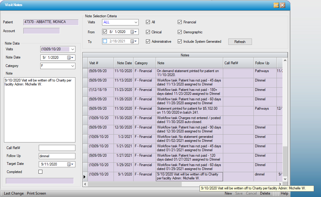 System Generated notes will be added by the system when Claims and Statements are generated, Workflow Tasks are created, Payment Plans are created and/or deleted, or visits are assigned to or removed from Collections. System generated messages cannot be edited or deleted.