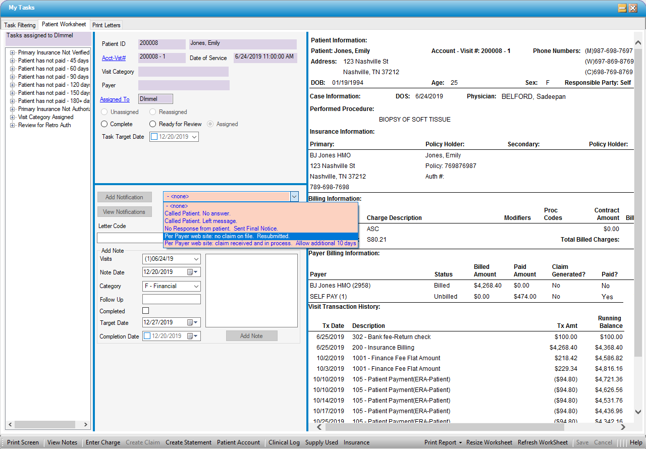 No Payment received – payer | If no insurance payment has been received from the currently assigned payer within the days designated, a task will generate. | When an insurance payment from the currently assigned payer is entered and posted, the task will auto close. |